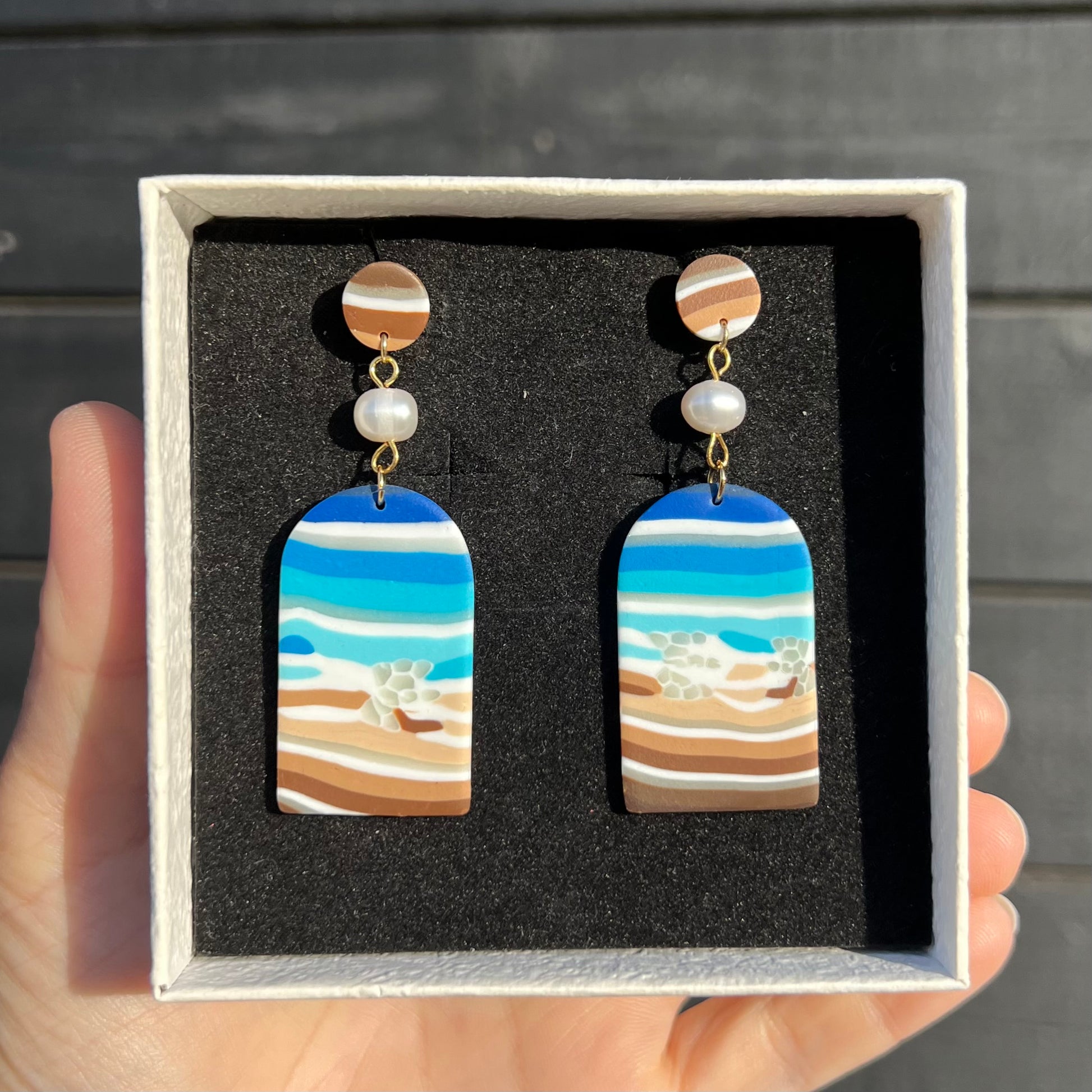 Smukke havtema-ørestikkere i cernit ler med ferskvandsperle. Smykkedele i kirurgisk stål. One of a kind :) Leveres i smykkeæske.