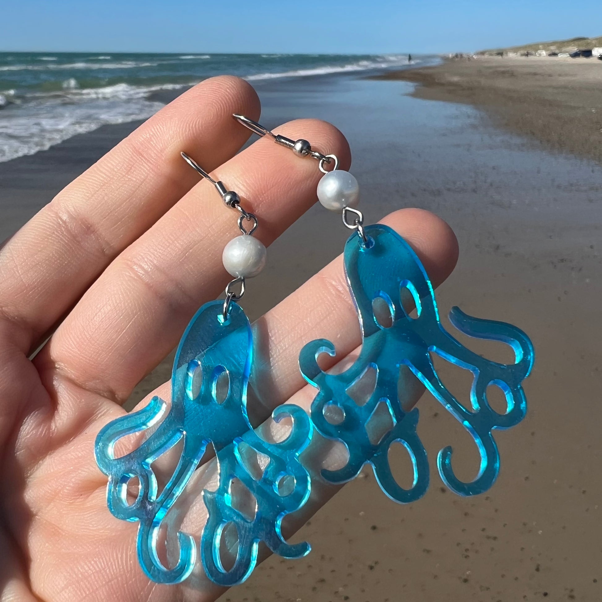 Blæksprutte øreringe i resin med ferskvandsperle. Smykkedele i kirurgisk stål. Leveres i smykkeæske.