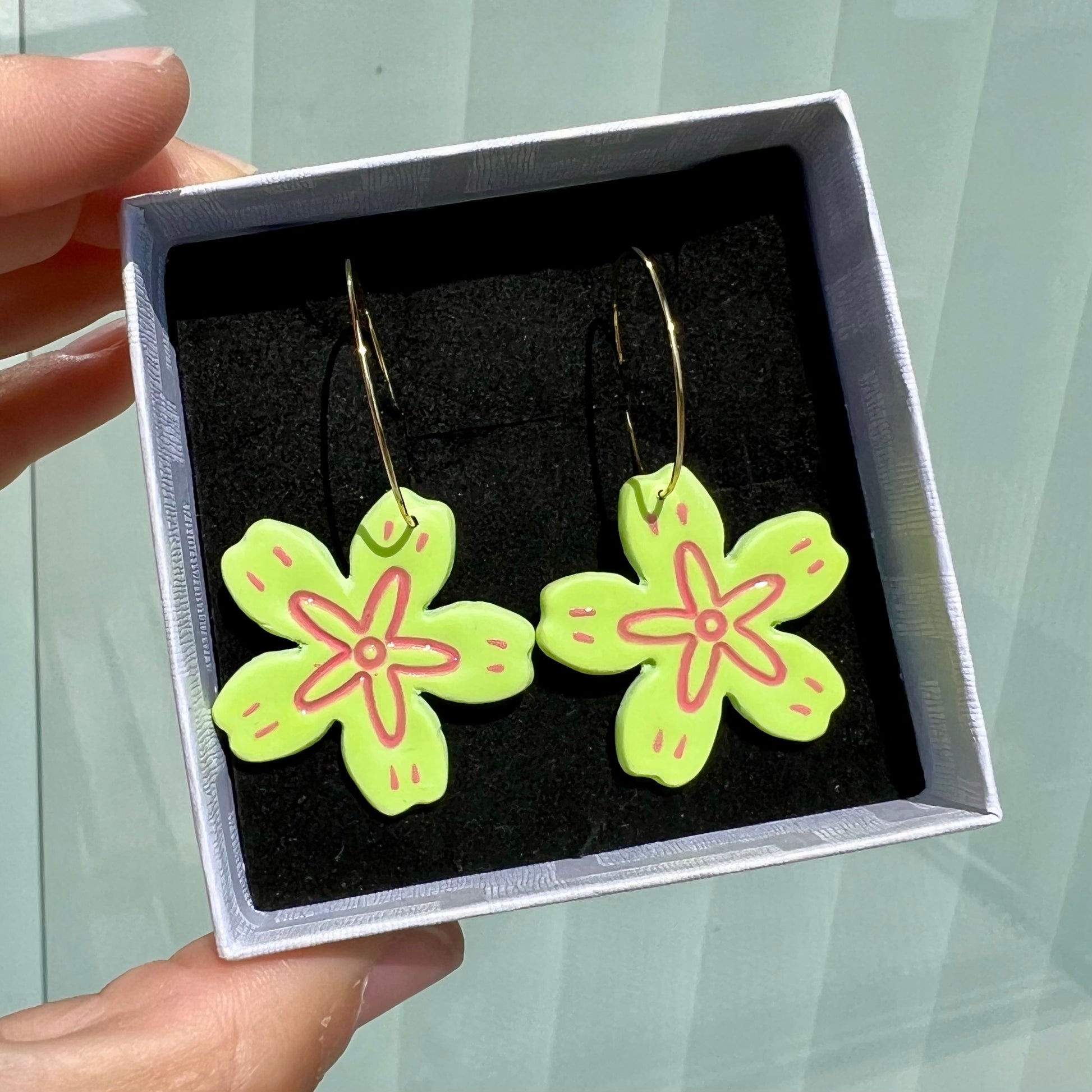 Øreringe i cernit ler med håndmalede detaljer. Smykkedele i kirurgisk stål. Leveres i smykkeæske.
