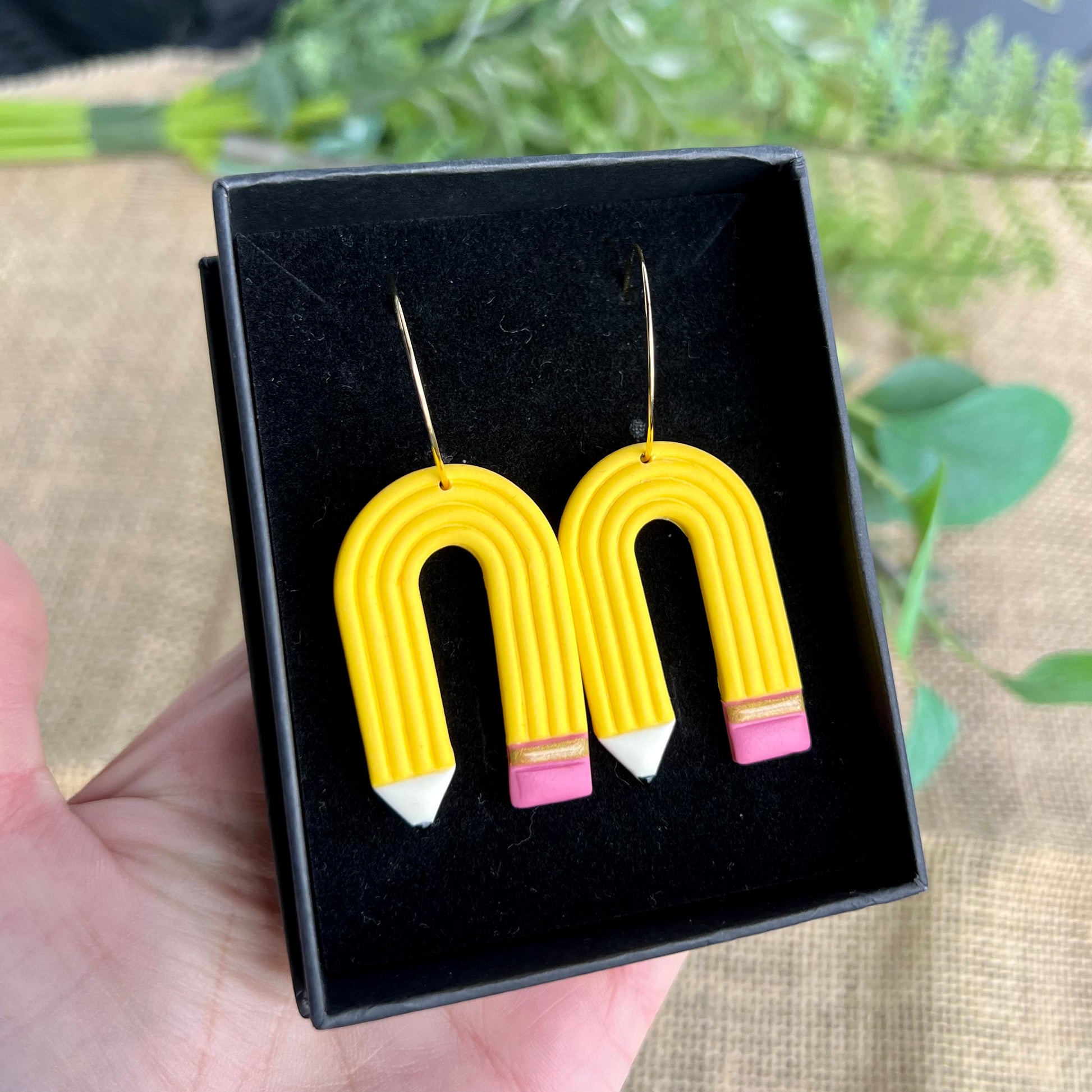 Blyant øreringe i cernit ler med ferskvandsperle. Smykkedele i forgyldt kirurgisk stål. Leveres i smykkeæske.
