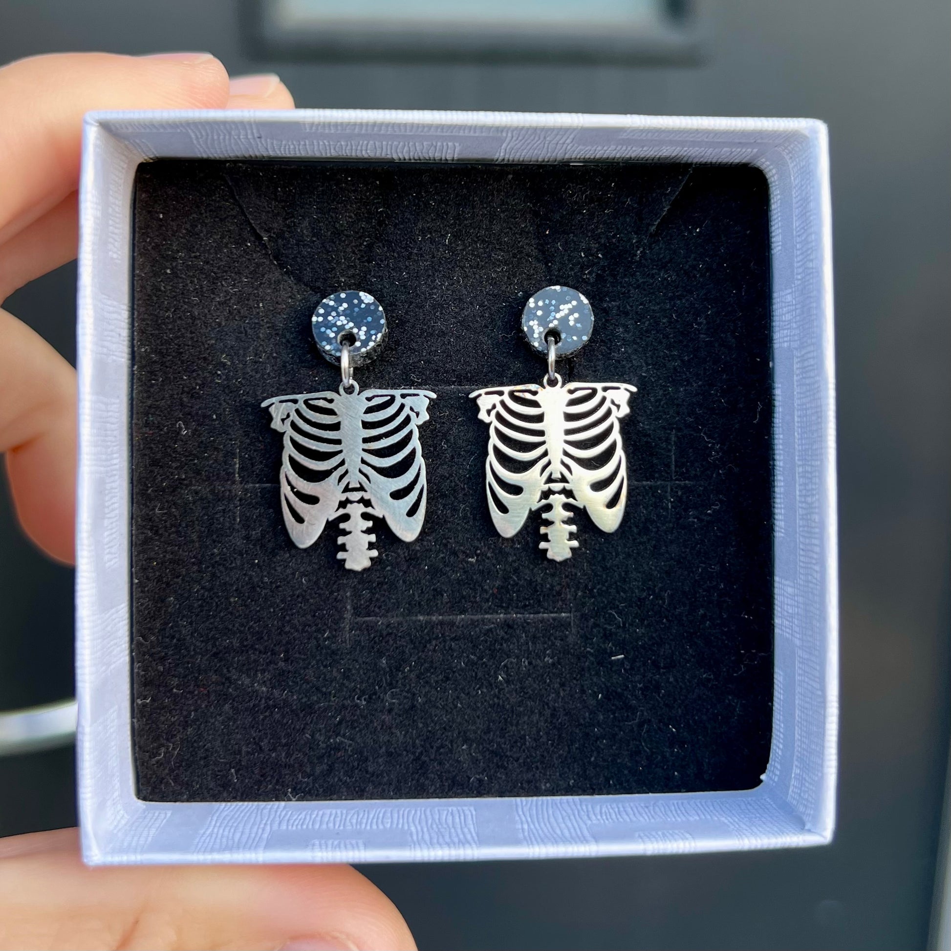 Ørestikkere i akryl med kirurgisk stål vedhæng. Smykkedele i kirurgisk stål. Leveres i smykkeæske.