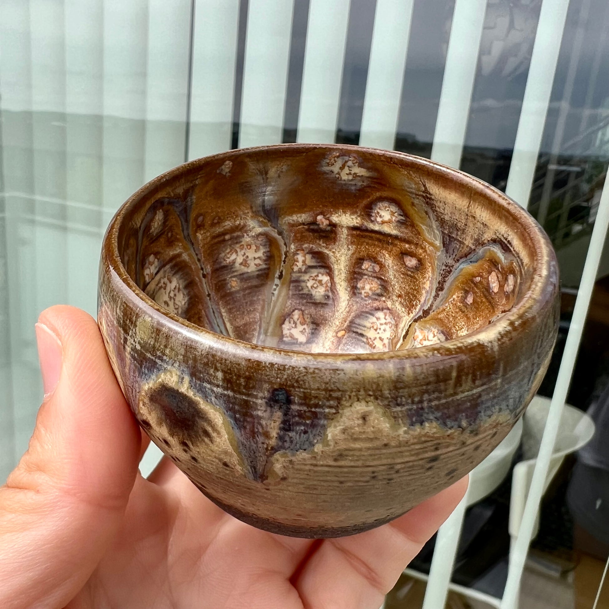En lille, håndlavet kop/sovseskål uden hank i smukke brunfarver. Koppen er drejet på drejeskiven, hvilket giver den et enkelt og elegant udtryk. Den tåler opvaskemaskine.