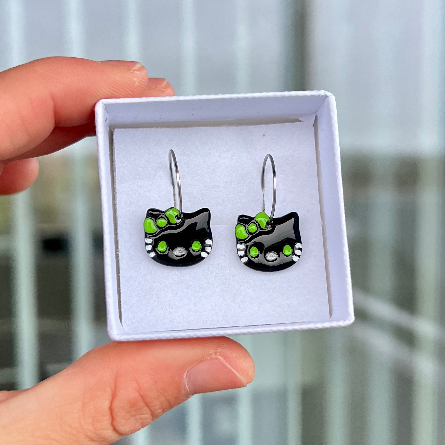 Kitty øreringe med håndmalede detaljer. Smykkedele i kirurgisk stål. Leveres i smykkeæske.