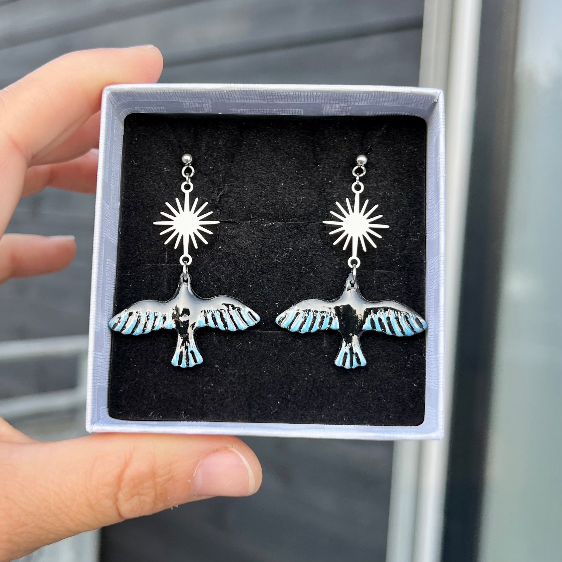 Fugl øreringe i cernit ler med håndmalede detaljer. Lakeret med resin. Smykkedele i kirurgisk stål. Leveres i smykkeæske.