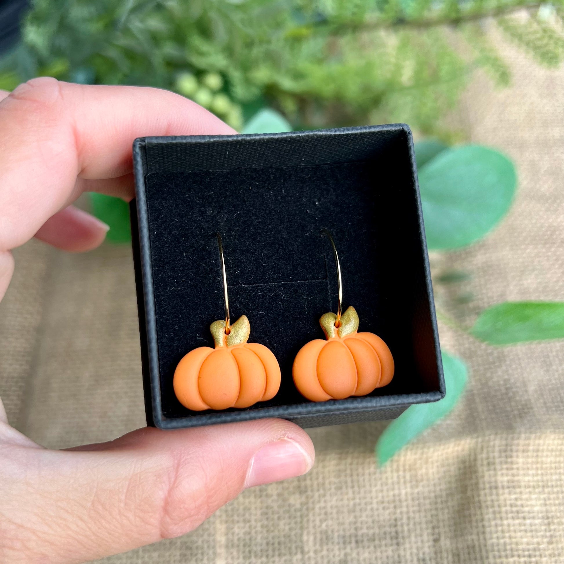 Smukke græskar øreringe i cernit ler. Smykkedele i forgyldt kirurgisk stål. Leveres i smykkeæske.