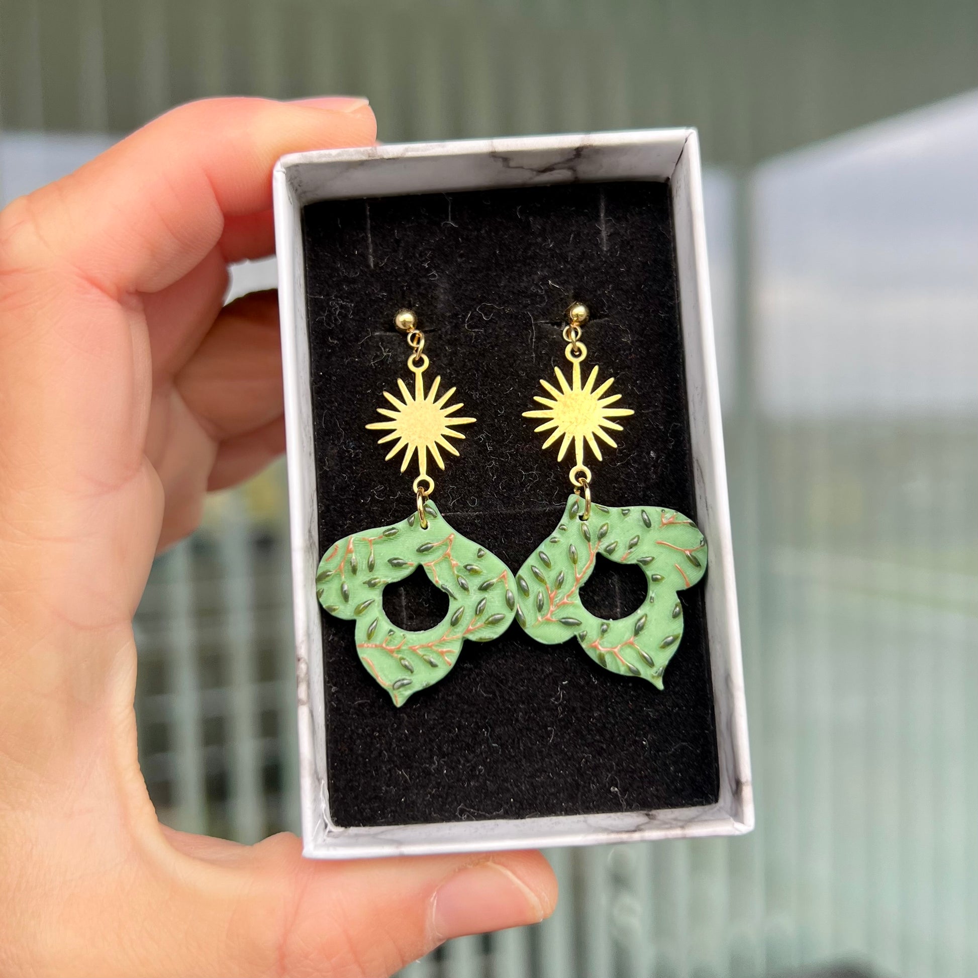 Smukke øreringe i cernit ler. Smykkedele i forgyldt kirurgisk stål. Leveres i smykkeæske.