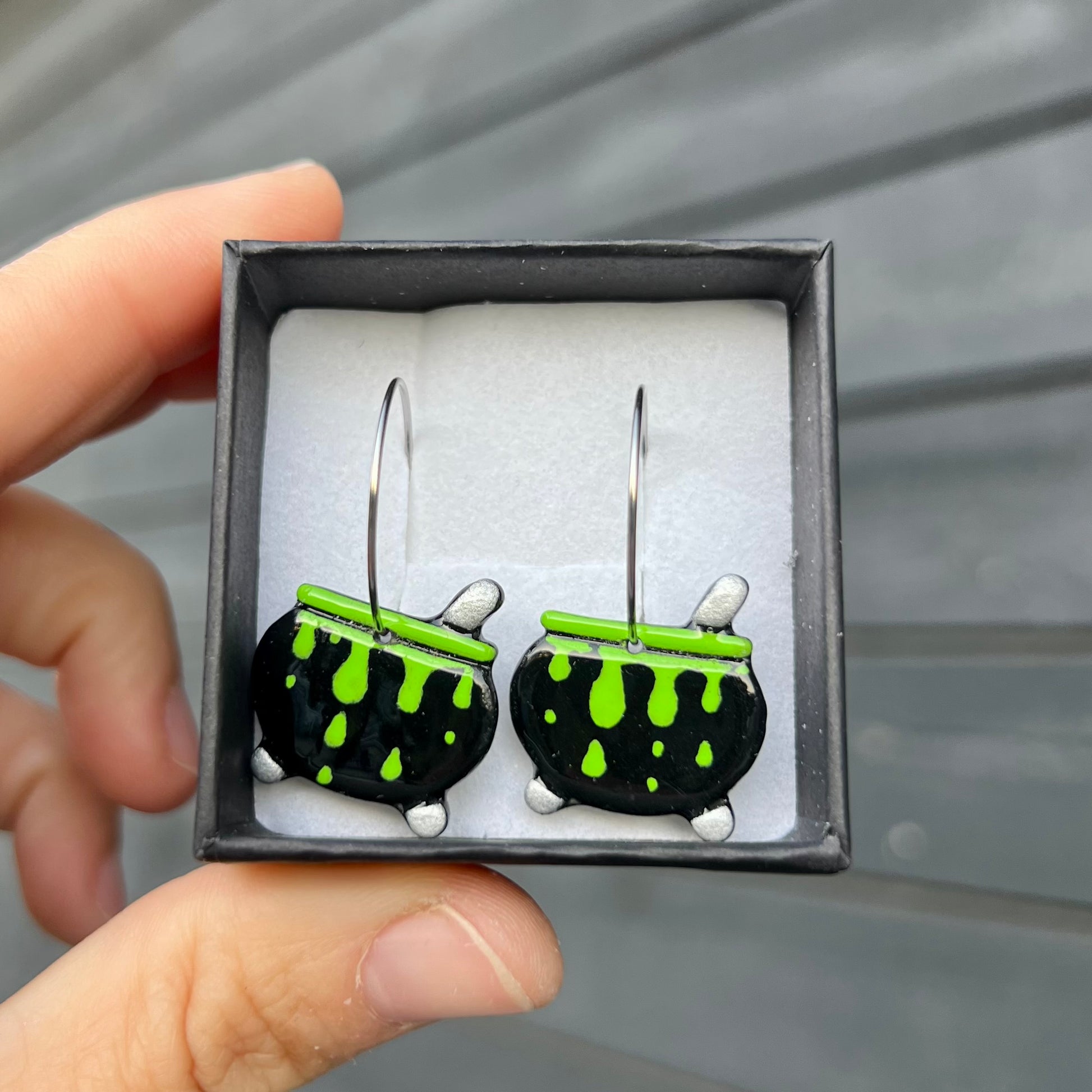 Sjove øreringe i cernit ler med håndmalede detaljer, lakeret med resin. Smykkedele i forgyldt kirurgisk stål. Da alle smykkerne er håndlavet kan de variere en smule i udseende. Leveres i smykkeæske.