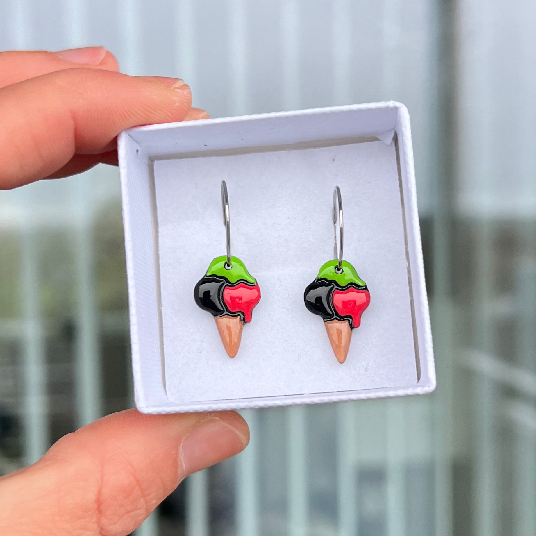 Sjove øreringe i cernit ler med håndmalede detaljer, lakeret med resin. Smykkedele i forgyldt kirurgisk stål. Da alle smykkerne er håndlavet kan de variere en smule i udseende. Leveres i smykkeæske.