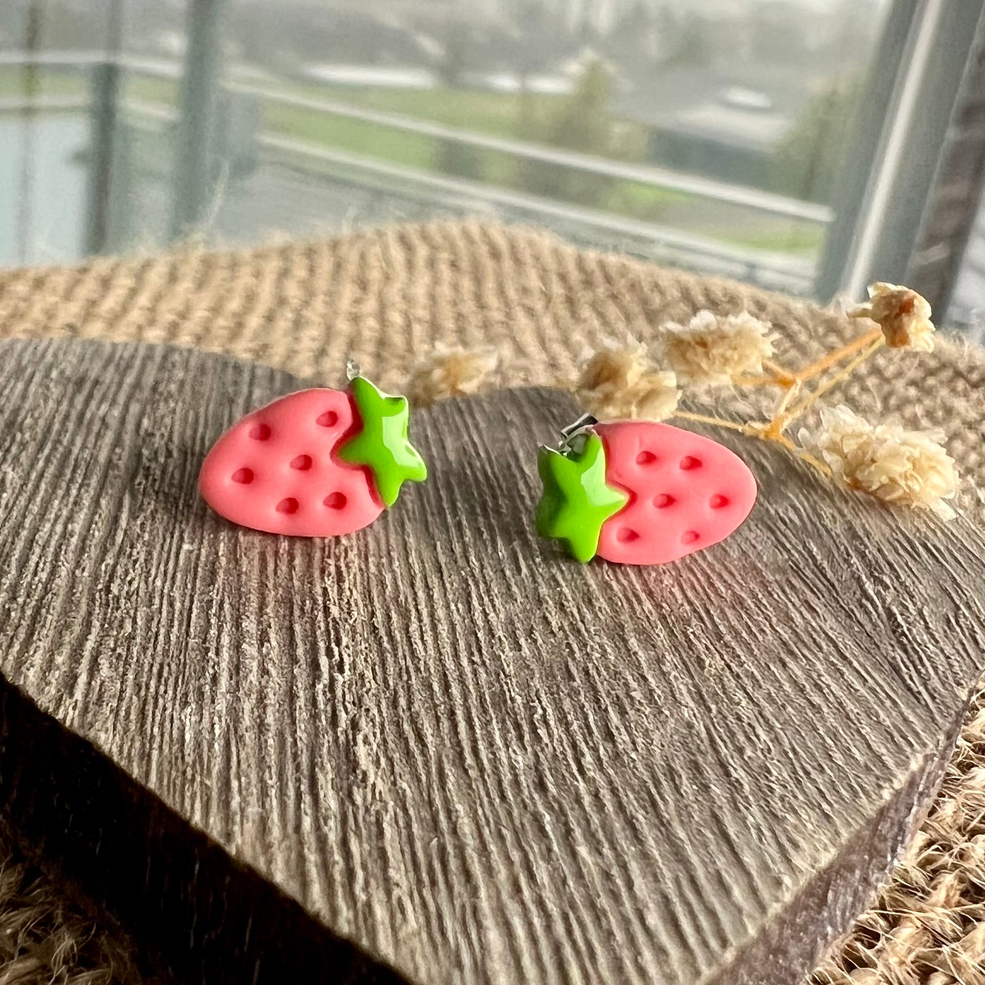 Jordbær ørestikker i cernit ler med håndmalede detaljer, lakeret med resin. Smykkedele i kirurgisk stål. Da alle smykkerne er håndlavet kan de variere en smule i udseende. Leveres i smykkeæske.