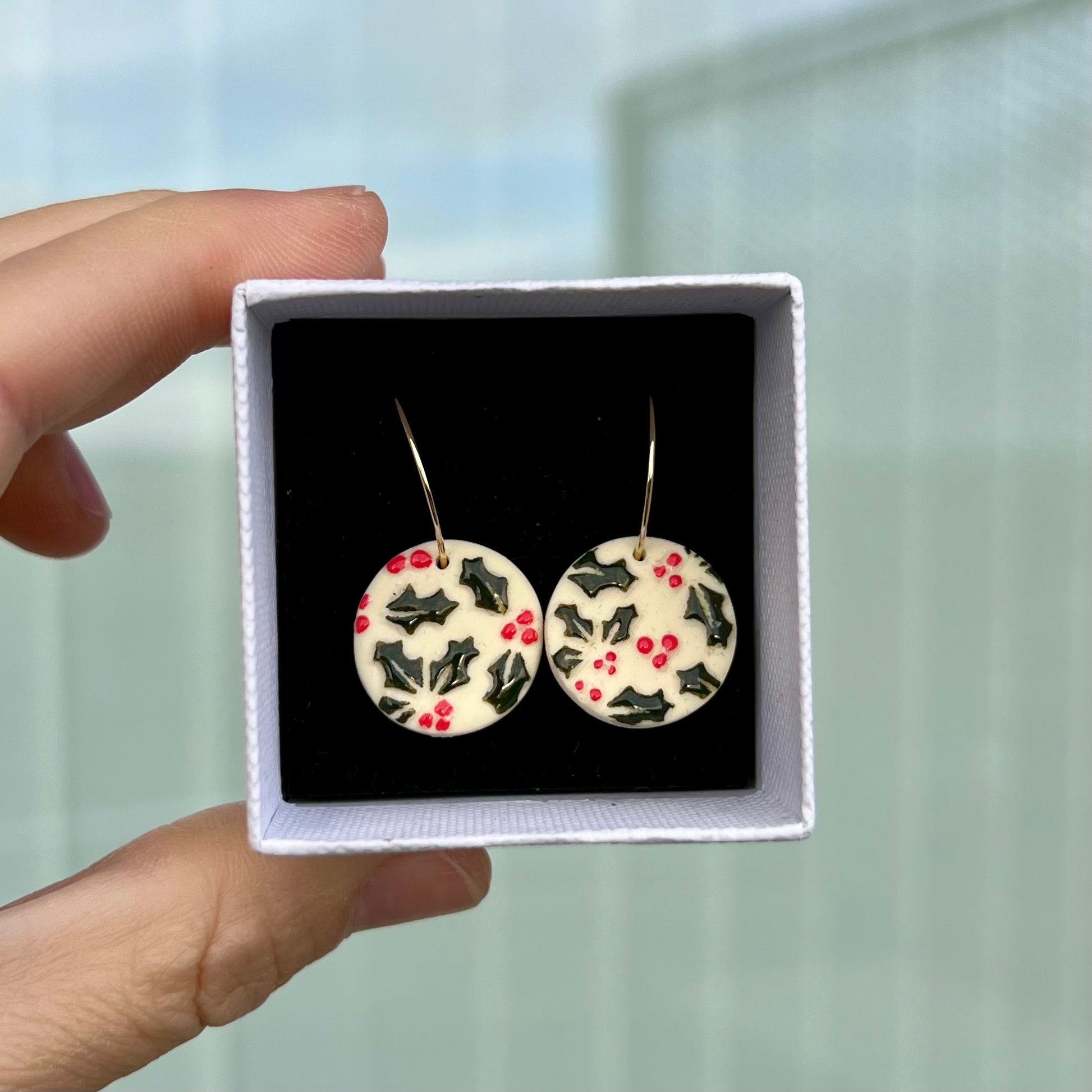 Jule øreringe i cernit ler med håndmalede detaljer, lakeret med resin. Smykkedele i kirurgisk stål. Leveres i smykkeæske.