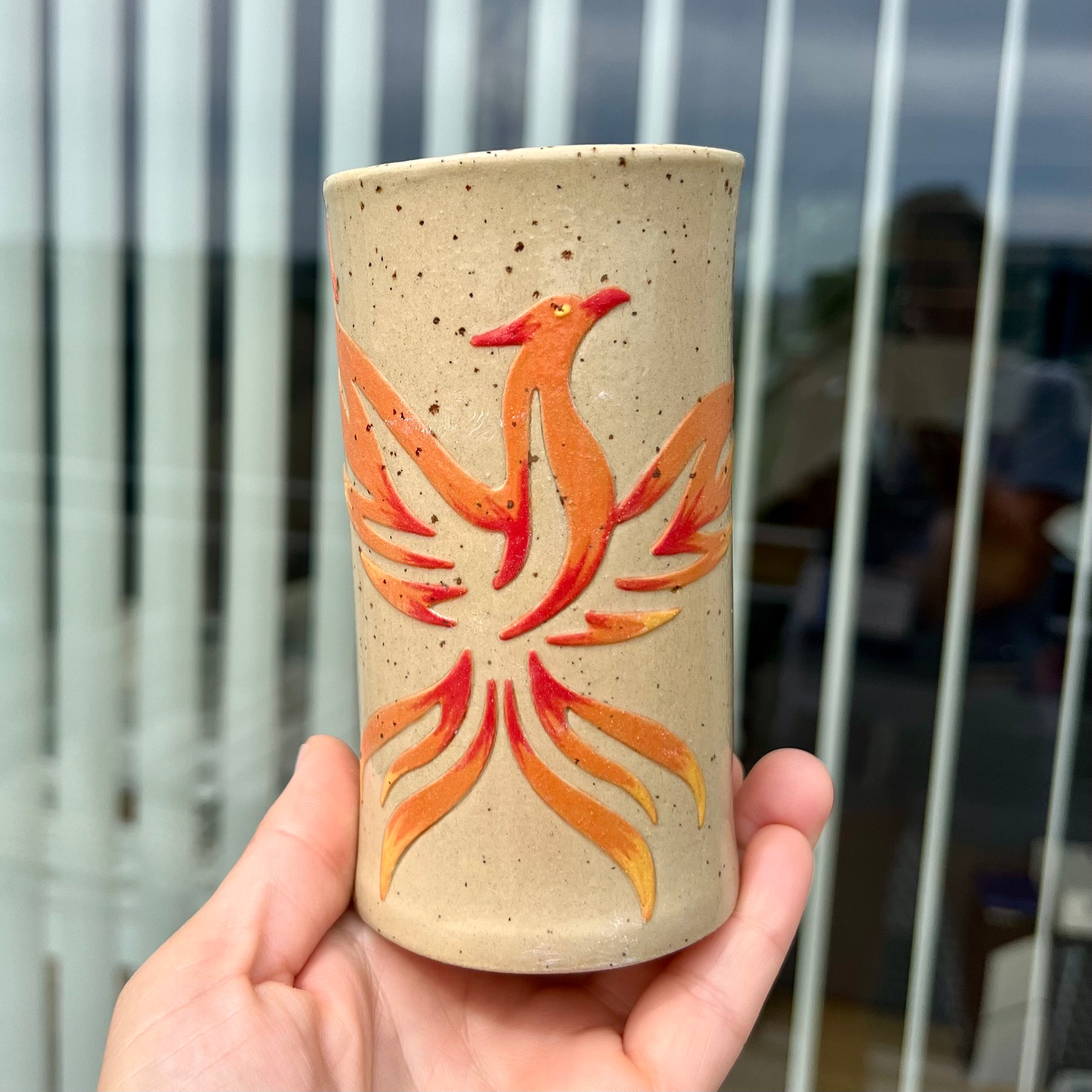 Denne unikke kop uden hank er inspireret af den mytiske fønix og er lavet med pladeteknik i stentøj. Lerplader er rullet ud med kagerullen og samlet, hvilket giver koppen et råt og unikt udtryk med tydelige samlinger. Håndmalede detaljer pynter koppen, og glasuren skaber smukke variationer, så hver kop bliver helt særlig. Den tåler opvaskemaskine, så den er både praktisk og flot. 😉