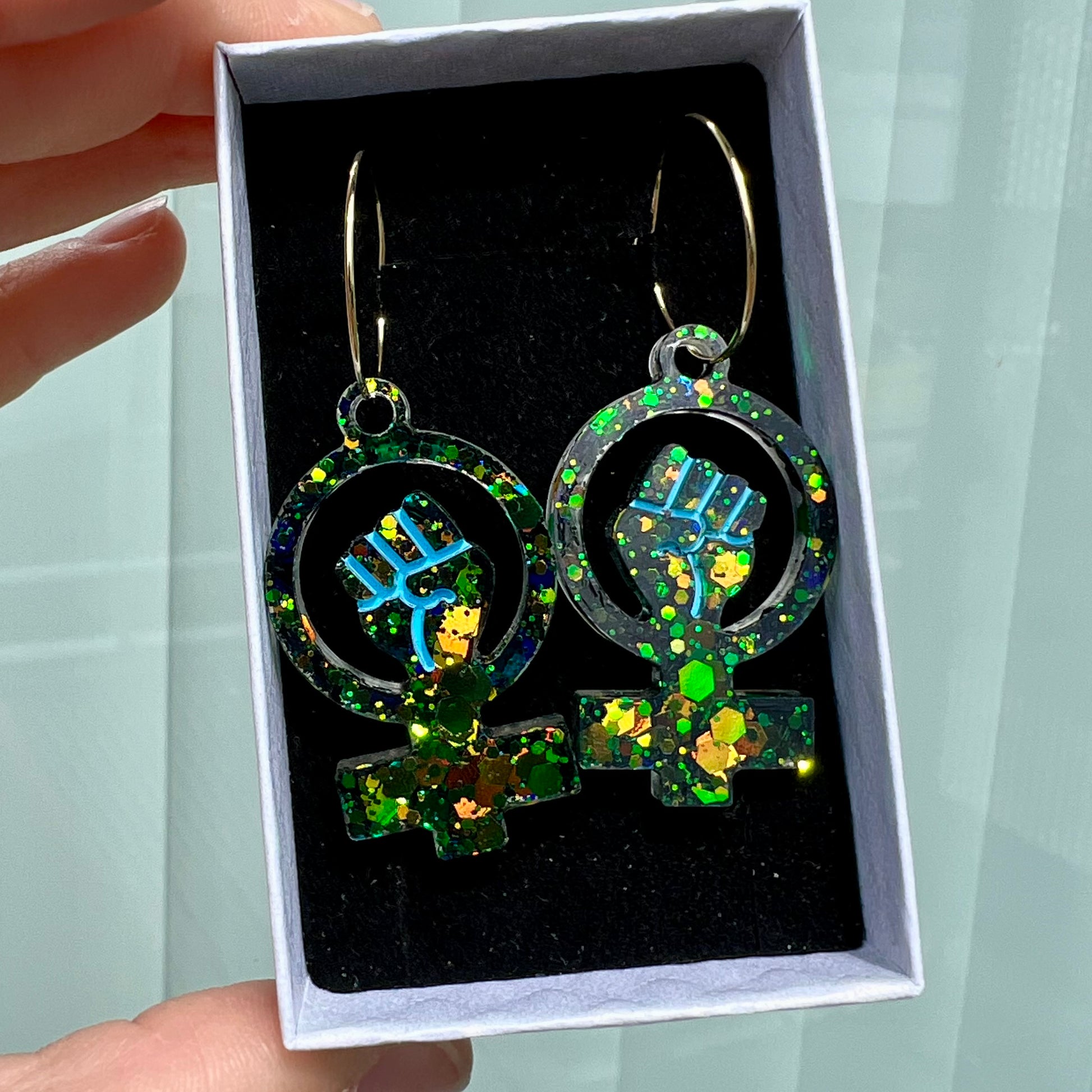Øreringe i resin. Smykkedele i kirurgisk stål. Da alle smykkerne er håndlavet kan de variere en smule i udseende. Leveres i smykkeæske.