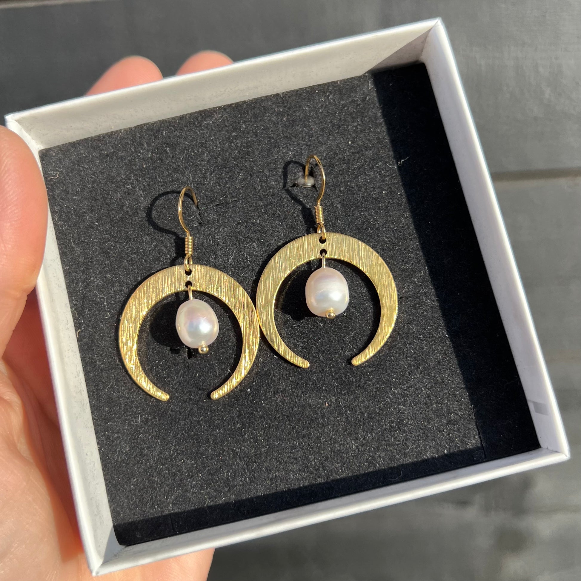 Øreringe med ferskvandsperle og messing med krog i forgyldt kirurgisk stål. Leveres i smykkeæske.