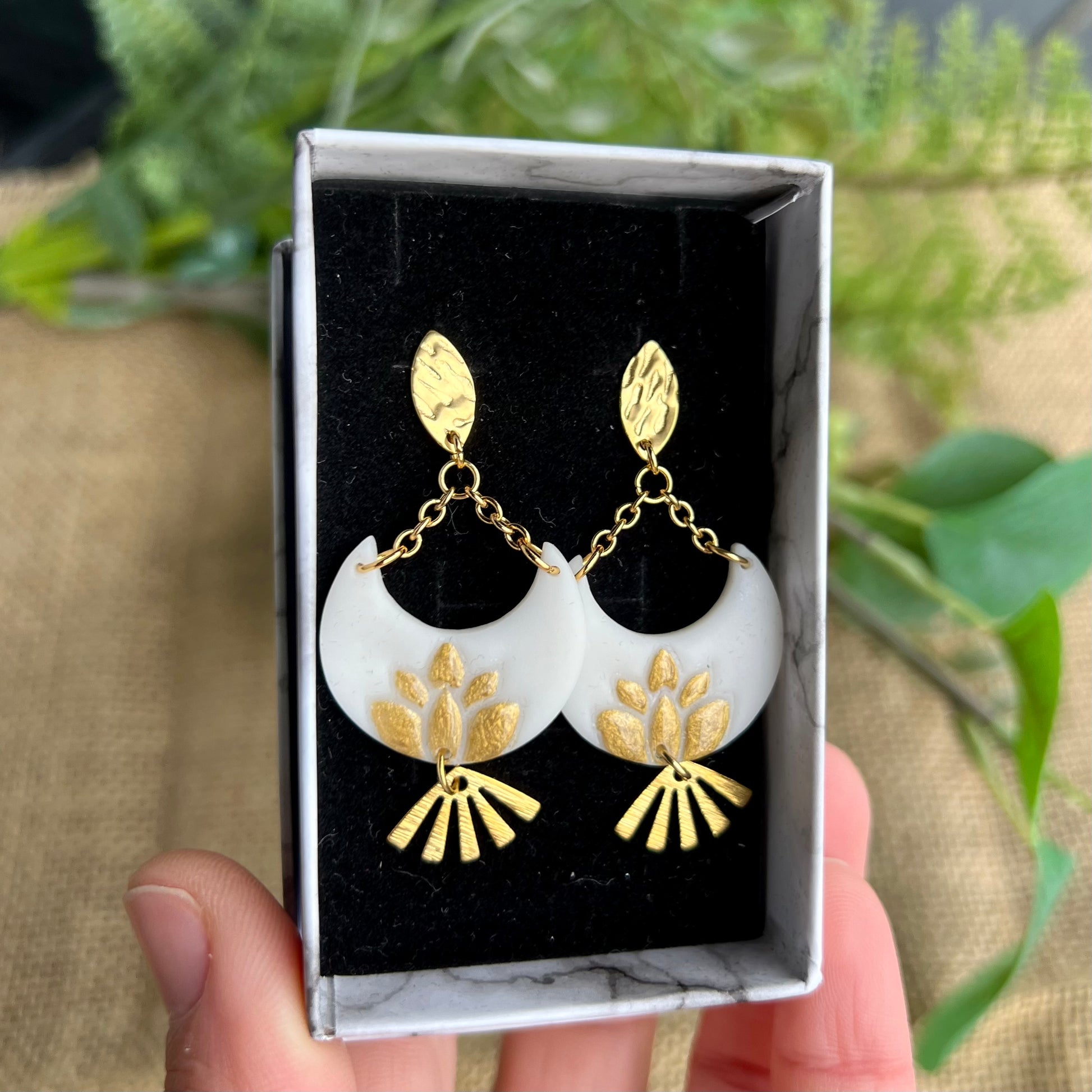 Smukke måne øreringe i cernit ler med ferskvandsperle. Smykkedele i forgyldt kirurgisk stål. Leveres i smykkeæske.