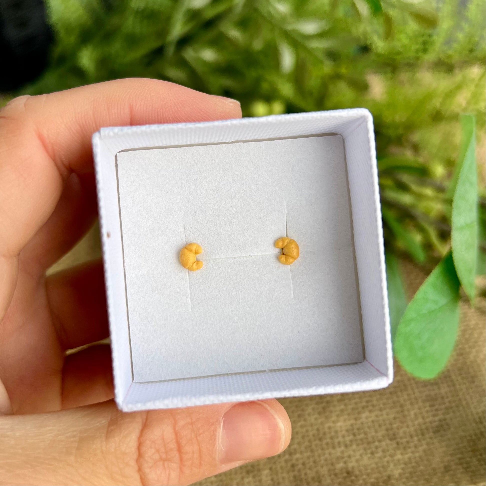 Mini croissant øreringe i cernit ler. Smykkedele i kirurgisk stål. Leveres i smykkeæske.