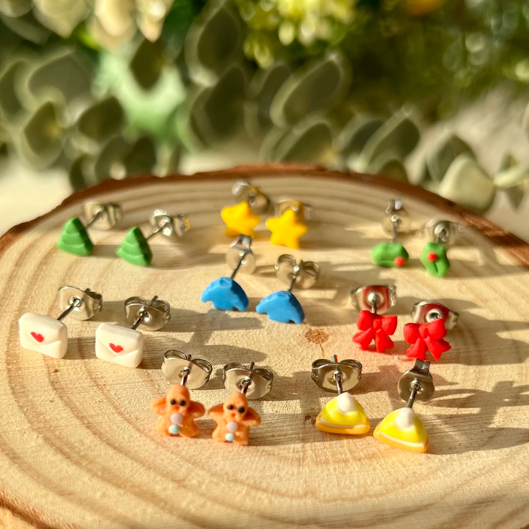 Mini juleørestikker i cernit ler med håndmalede detaljer. Smykkedele i kirurgisk stål. Leveres i smykkeæske.