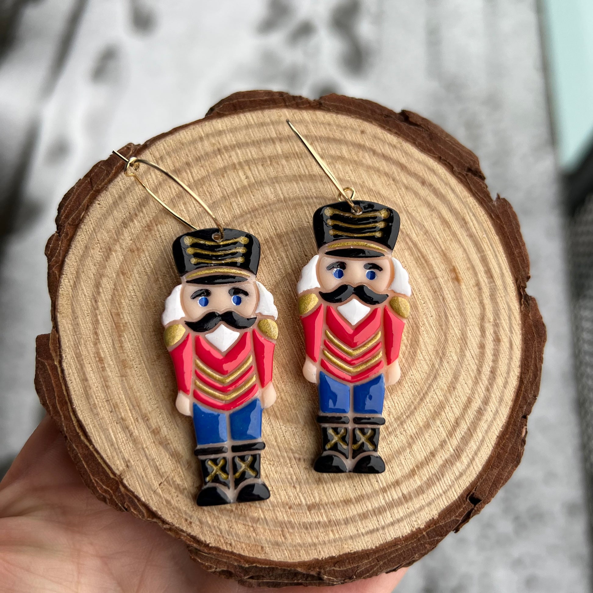 Jule øreringe i cernit ler med håndmalede detaljer, lakeret med resin. Smykkedele i kirurgisk stål. Leveres i smykkeæske.