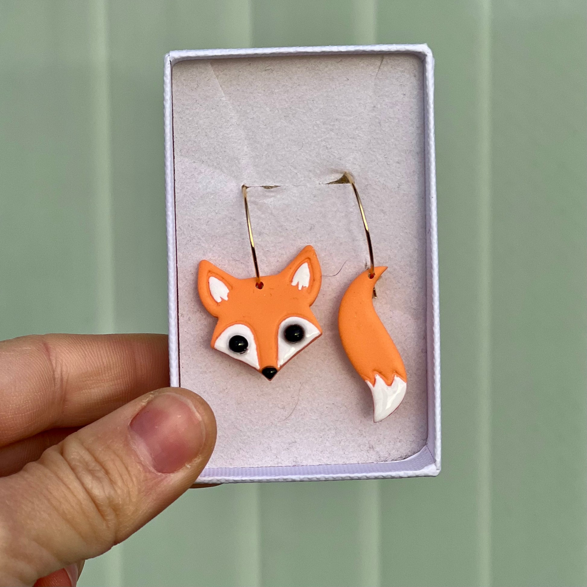 Søde ræv øreringe i cernit ler med håndmalede detaljer. Lakeret med resin. Smykkedele i kirurgisk stål. Leveres i smykkeæske.