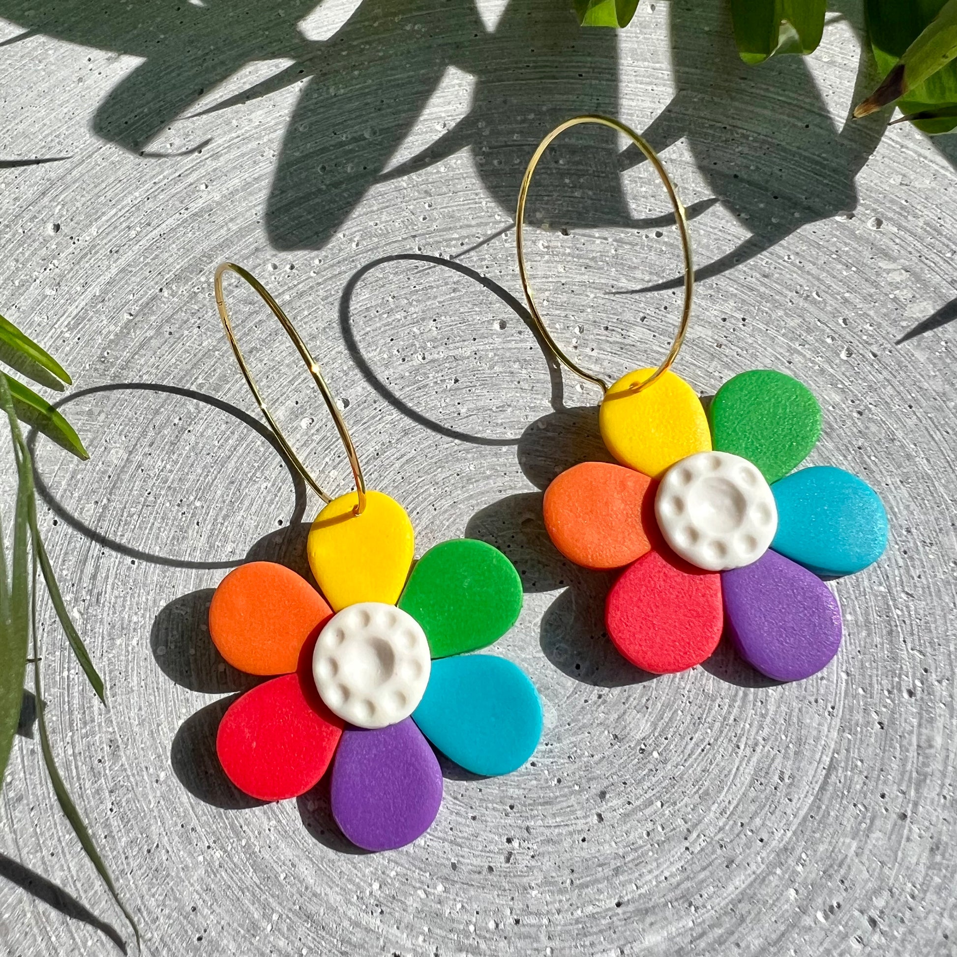 Regnbue blomst øreringe i cernit ler. Smykkedele i forgyldt kirurgisk stål. Leveres i smykkeæske.