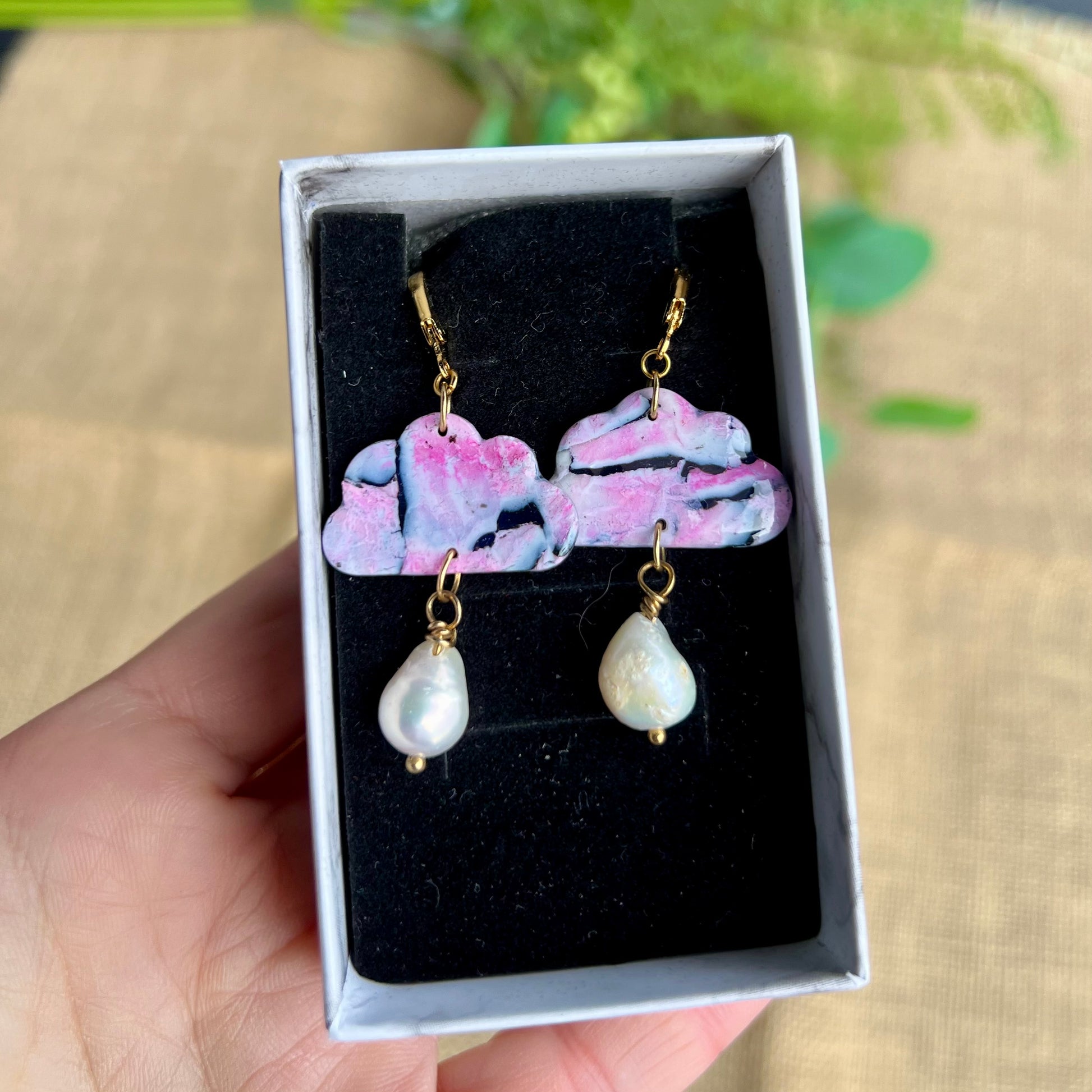 Smukke sky øreringe i cernit ler med ferskvandsperle. Smykkedele i forgyldt kirurgisk stål. Leveres i smykkeæske.