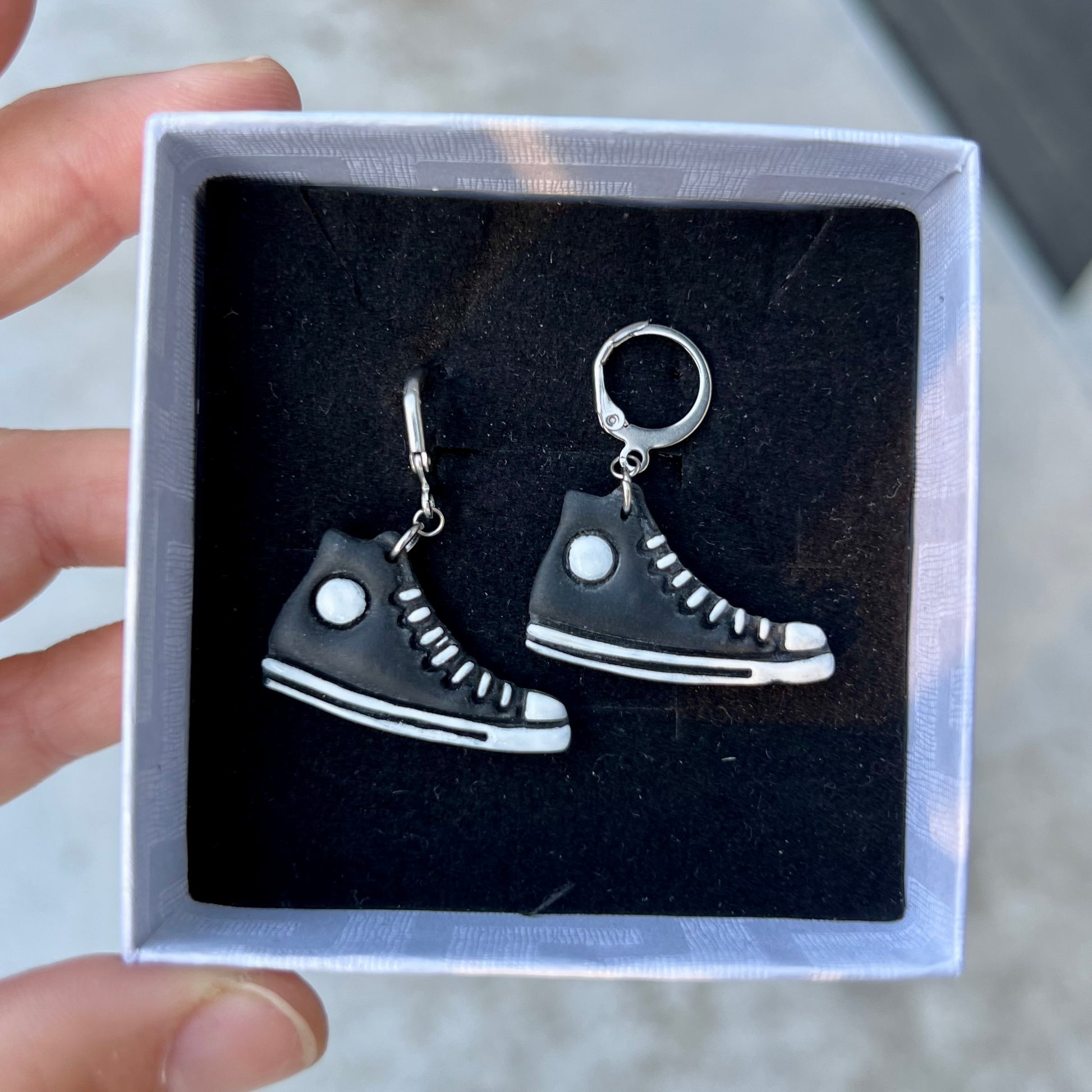 Øreringe i cernit ler, lakeret med resin. Smykkedele i kirurgisk stål. Da alle smykkerne er håndlavet kan de variere en smule i udseende. Leveres i smykkeæske.