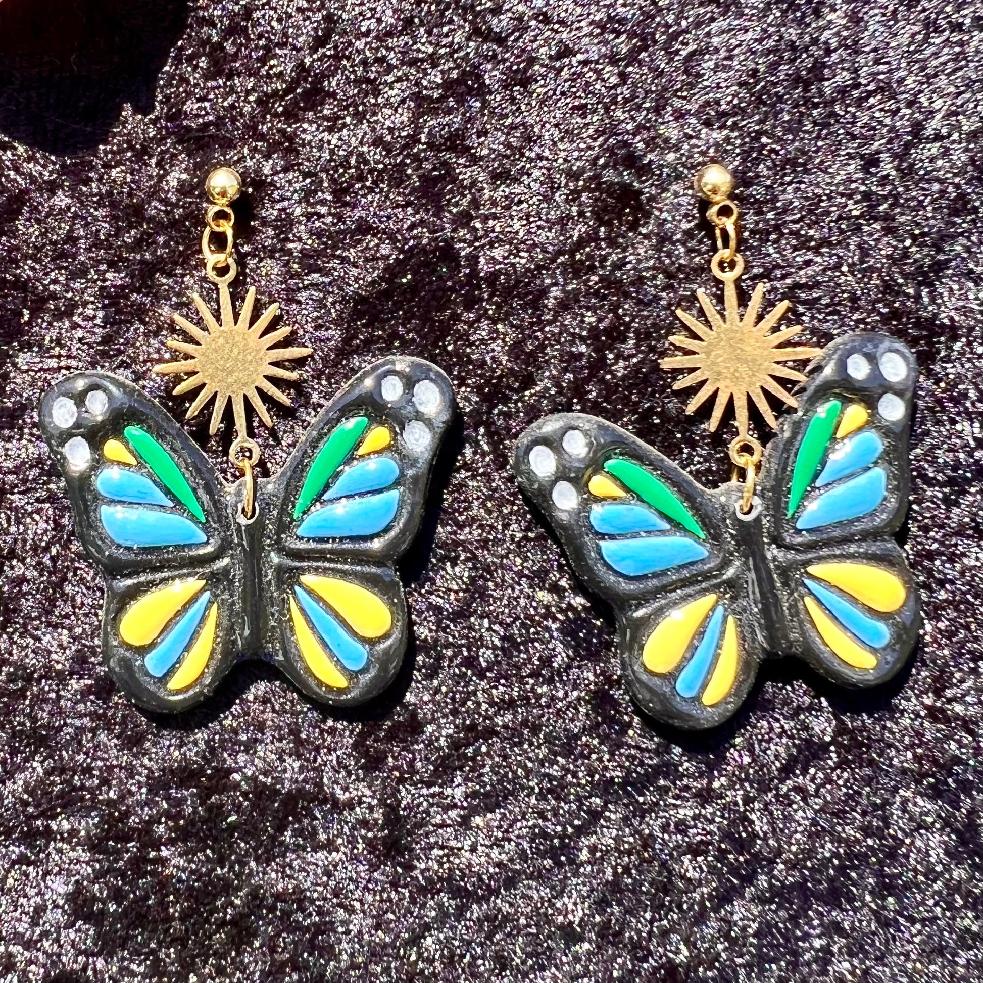 Sommerfugl øreringe i cernit ler med håndmalede detaljer, lakeret med resin. Smykkedele i forgyldt kirurgisk stål. Da alle smykkerne er håndlavet kan de variere en smule i udseende. Leveres i smykkeæske.