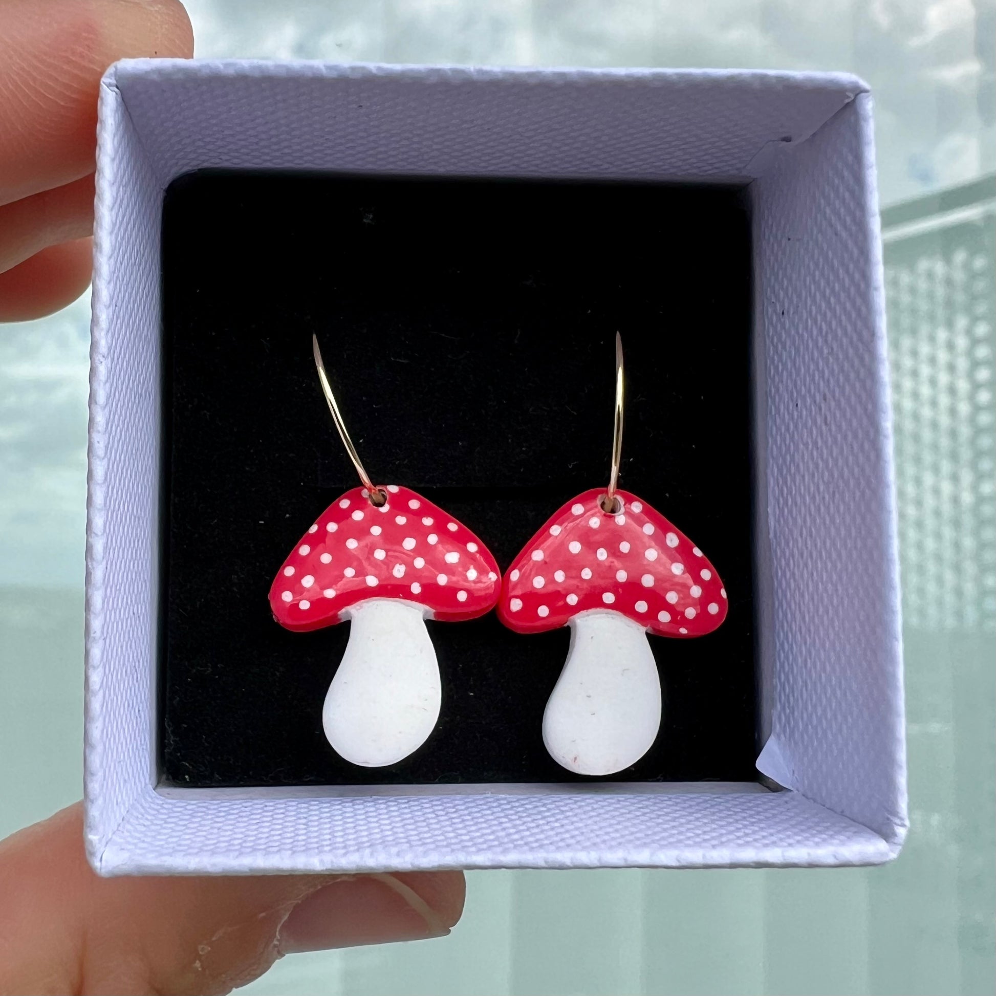 Øreringe i cernit ler. Smykkedele i kirurgisk stål. Leveres i smykkeæske.