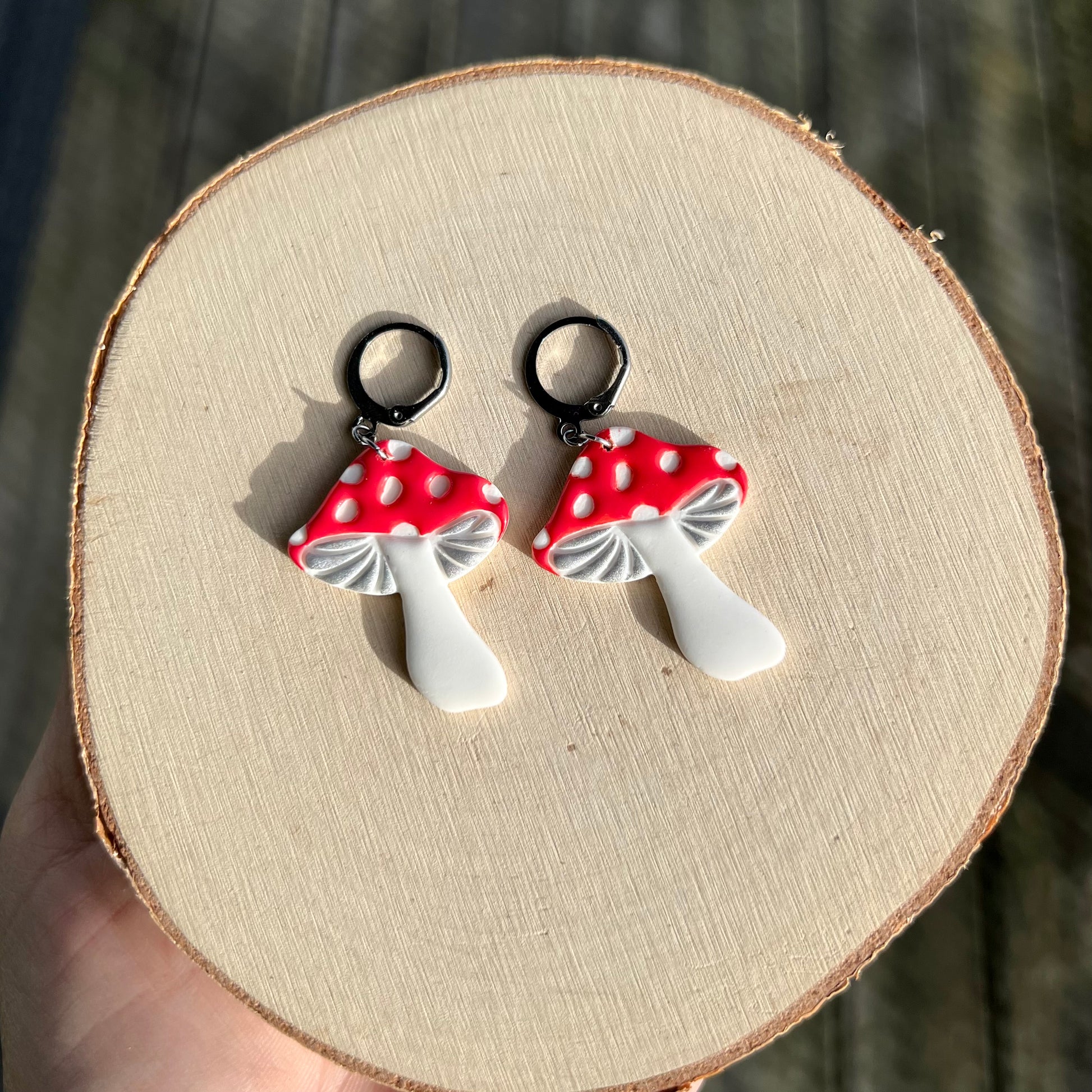 Svampe øreringe i cernit ler med håndmalede detaljer, lakeret med resin. Smykkedele i kirurgisk stål. Da alle smykkerne er håndlavet kan de variere en smule i udseende. Leveres i smykkeæske.