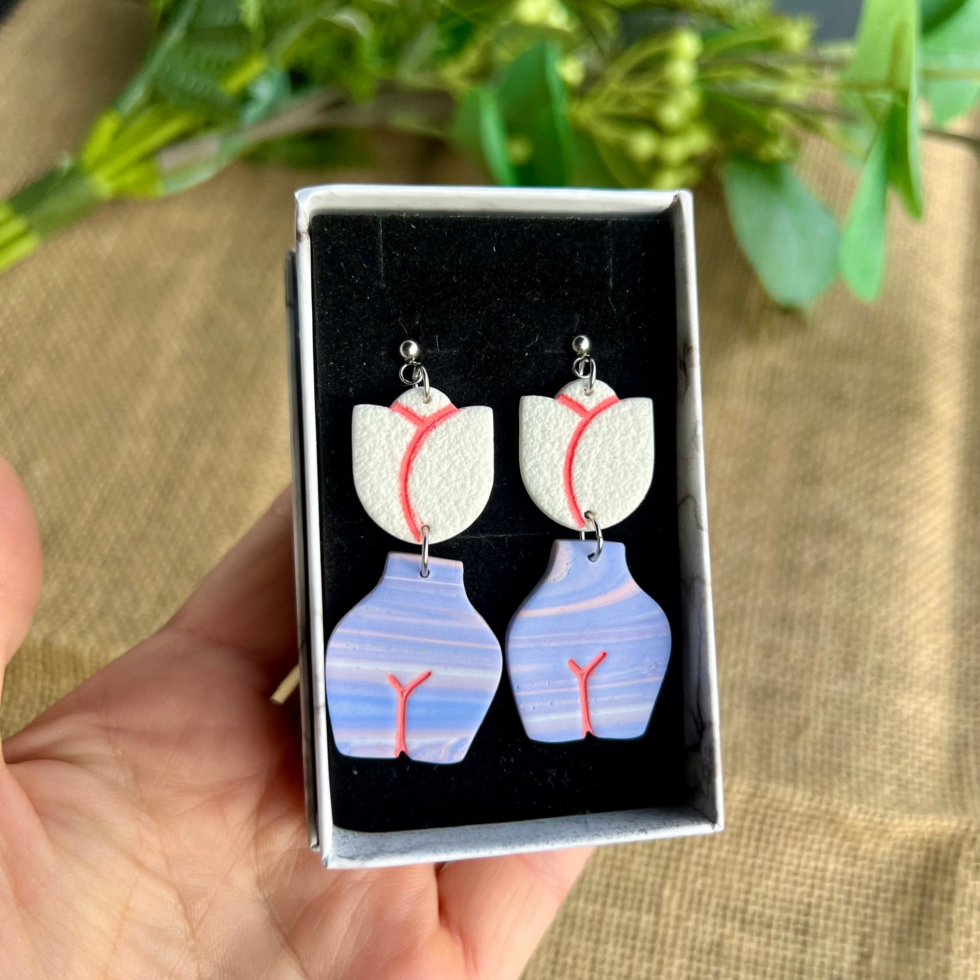 Fine tulipan øreringe i cernit ler. Smykkedele i forgyldt kirurgisk stål. Leveres i smykkeæske.