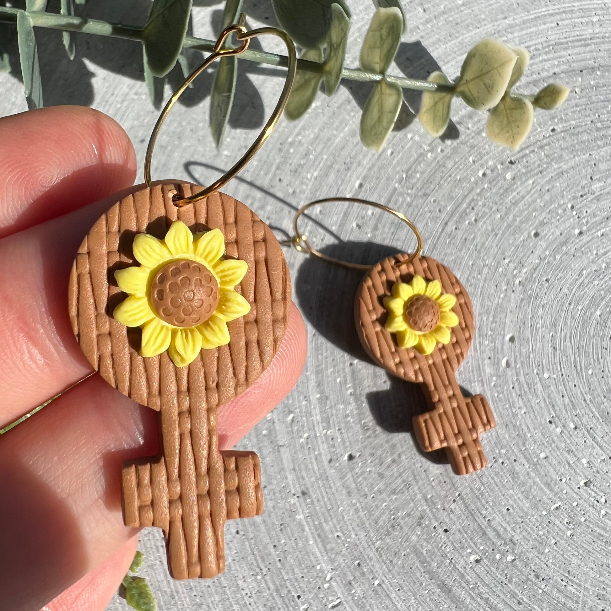 Venus øreringe i cernit ler med solsikke. Lakeret med resin. Smykkedele i forgyldt kirurgisk stål. Leveres i smykkeæske.