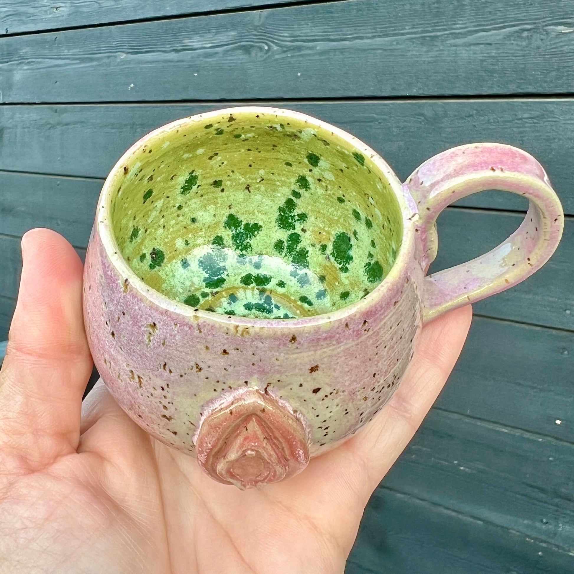 Denne kop er en charmerende, håndlavet kop med motiv af Vulva. Den er drejet i stentøj og glaseret med omhu. Da hver kop er skabt i hånden, og glasuren reagerer forskelligt under brændingen, vil der opstå små variationer, som gør hver enkelt kop helt unik. Den tåler opvaskemaskine.