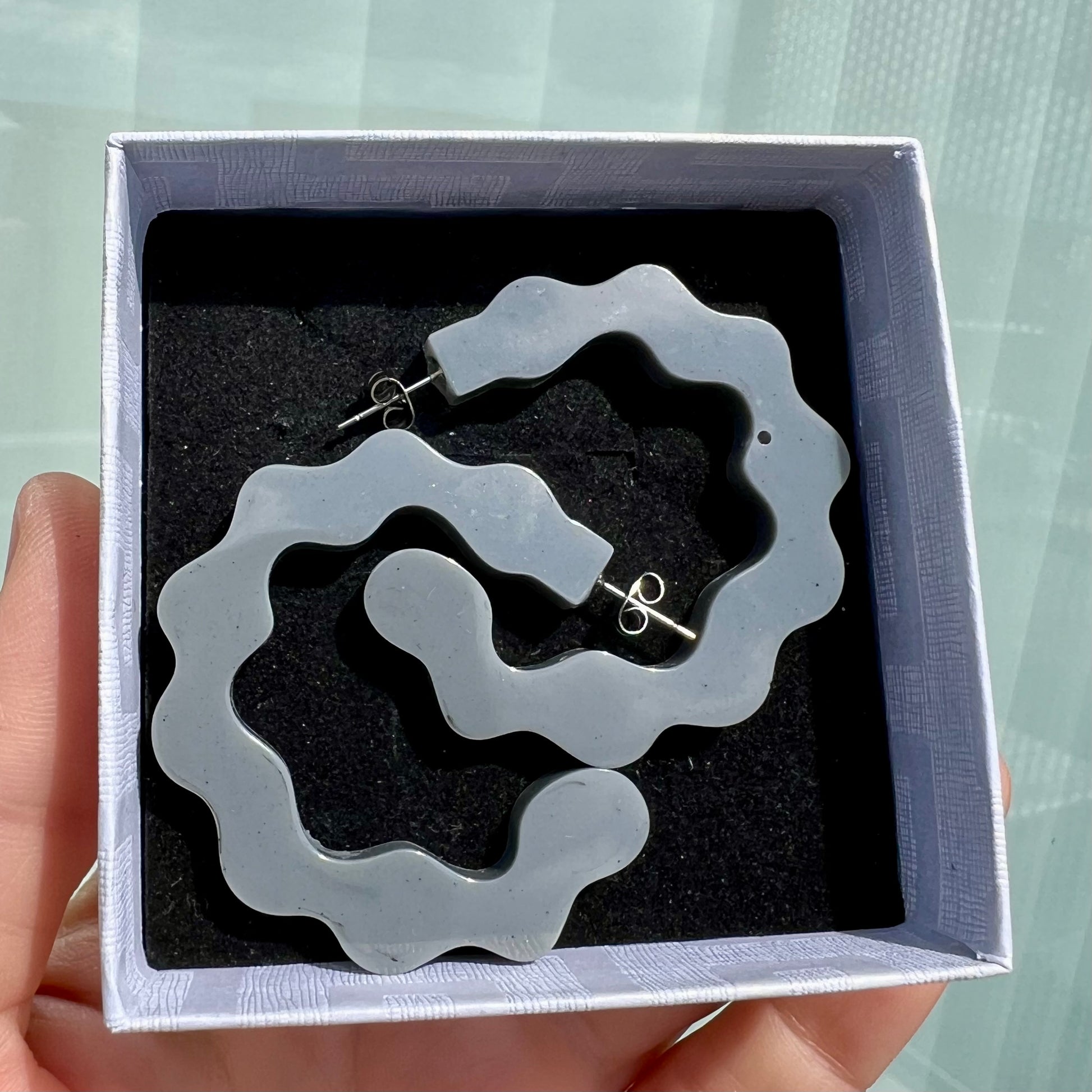 Øreringe i resin. Smykkedele i kirurgisk stål. Da alle smykkerne er håndlavet kan de variere en smule i udseende. Leveres i smykkeæske.